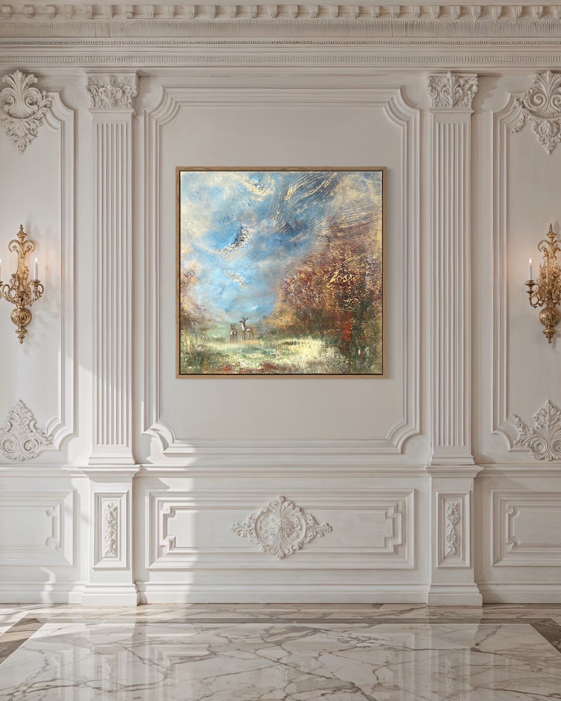 En orginalmålning i varma toner men mycket struktur och guld.