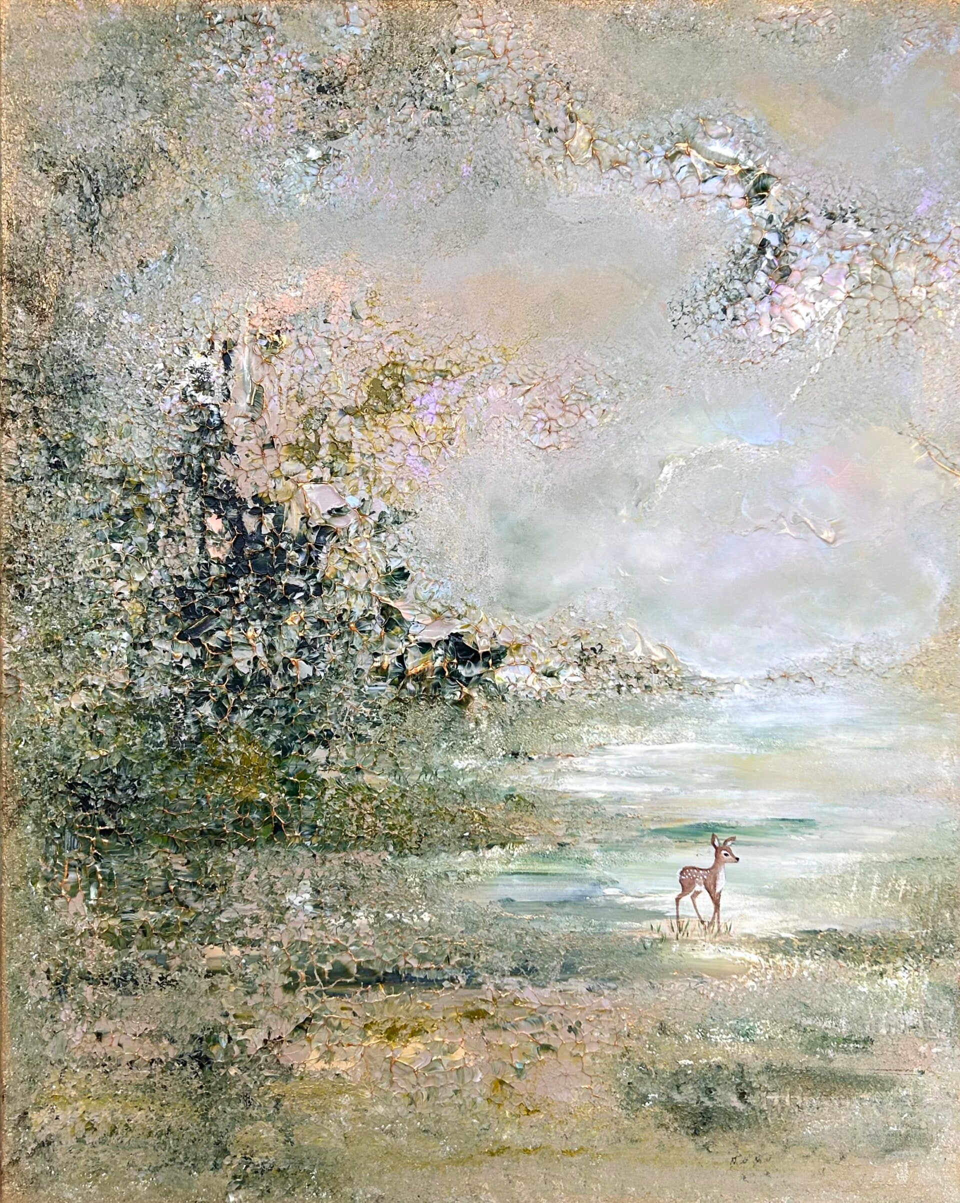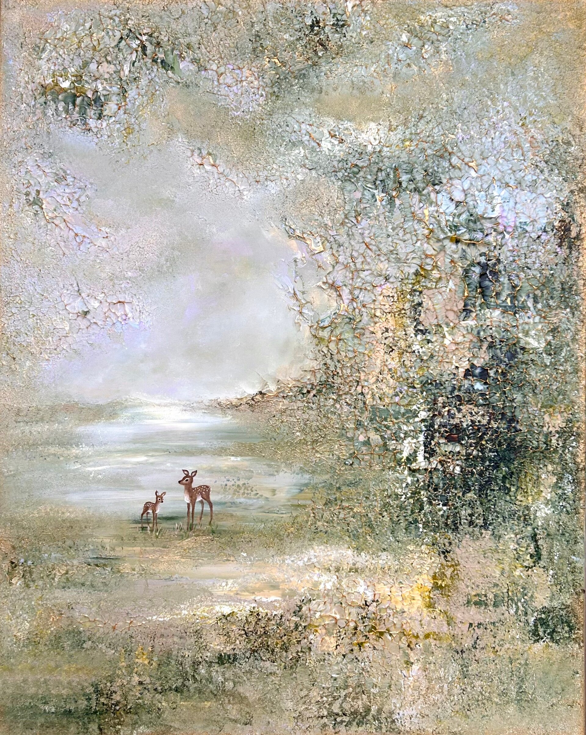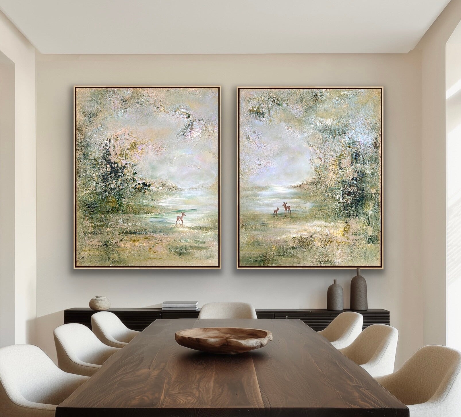 En orginalmålning i set om två tavlor. Målad i ljusa harmoniska färger och med tre rådjur. mått 80x100 cm x2
